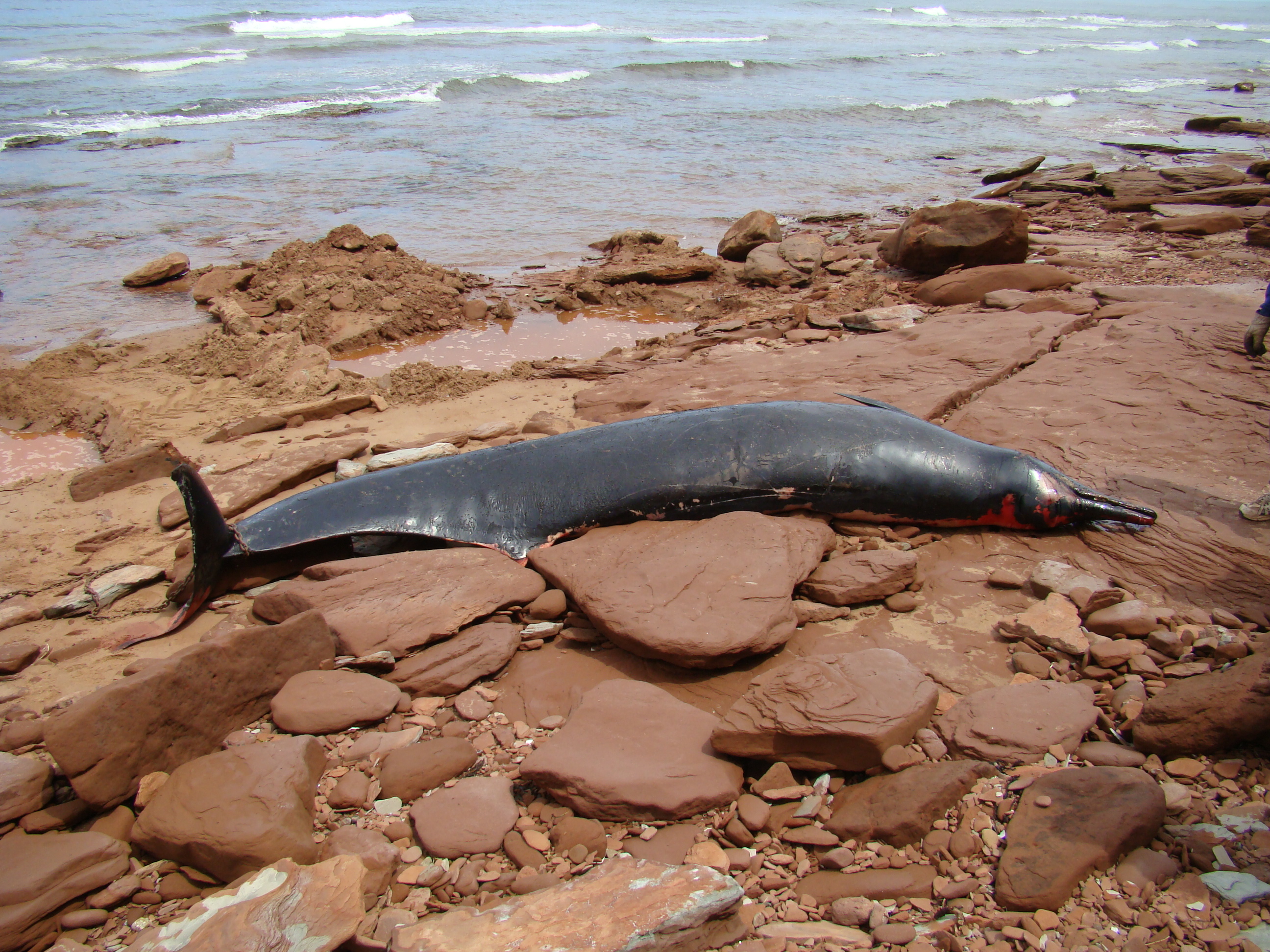 A recently dead adult male whale that was found on the north shore of Prince Edward Island in early June was identified as a Sowerby’s beaked whale (Mesoplodon bidens). It is very rare to find stranded or beached beaked whales of any species as they tend to live in deep offshore waters and they are thought to be few in number. This particular species, Sowerby’s, has one of the most northerly distributions among beaked whales. It is also one of the most common beaked whales to strand. However, this is only the second record of stranding of an individual of this species on Canadian Maritime shores, although a number of strandings have been recorded in Newfoundland and Labrador and also in Massachusetts.