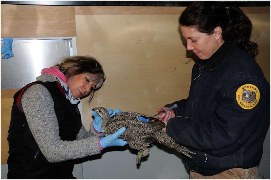 The Greater Northern Sage-Grouse is on the path to extinction in Canada with 13 males in Alberta and 18 males in Saskatchewan at the latest lek counts. The “Sage-Grouse Recovery Project” has put together an interdisciplinary group of University of Calgary researchers (from the Faculties/Departments of Veterinary Medicine, Biological Sciences, Environmental Design and Geography who are affiliated with the interdisciplinary Wildlife Ecology Group), Government Agencies (Alberta Sustainable Resource Development & Montana Fish, Wildlife & Parks) and the Energy Sector to try and reverse this dire situation. We are applying conservation strategies at a regional scale to stabilize and increase the sub population of Sage-Grouse in southern Alberta. Over the past two springs (2011-12) a total of 41 birds (38 females) were translocated from active leks from large, stable populations in south central Montana, to the silver sagebrush ecosystems of southern Alberta, areas historically used by this species. The Montana birds were released at the remnant Alberta lek sites which still had displaying males and attending females.