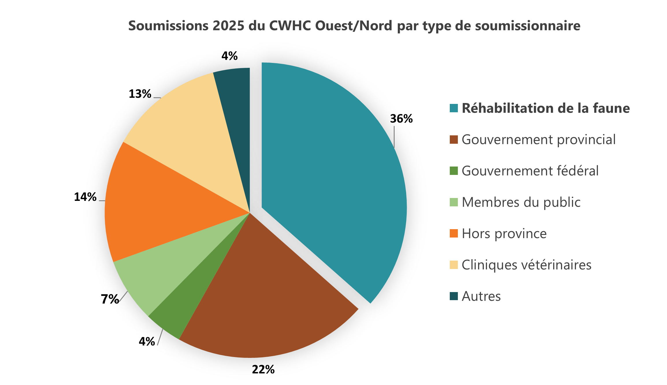 Ce programme ne pourrait fonctionner sans les signalements et les soumissions d’animaux malades ou morts par le public, ainsi que la collaboration de divers organismes, notamment les agents de conservation, les agences gouvernementales fédérales et provinciales, les cliniques vétérinaires et les biologistes. En Saskatchewan, les centres de réhabilitation de la faune constituent le plus important contributeur à notre programme de surveillance (figure 1), représentant 36 % des cas soumis au centre de l’Ouest et Nord du RCSF en 2025. Des centres comme Living Sky Wildlife Rehabilitation (LSWR) à Saskatoon et Salthaven West à Regina sont les vedettes de l’article d’aujourd’hui.