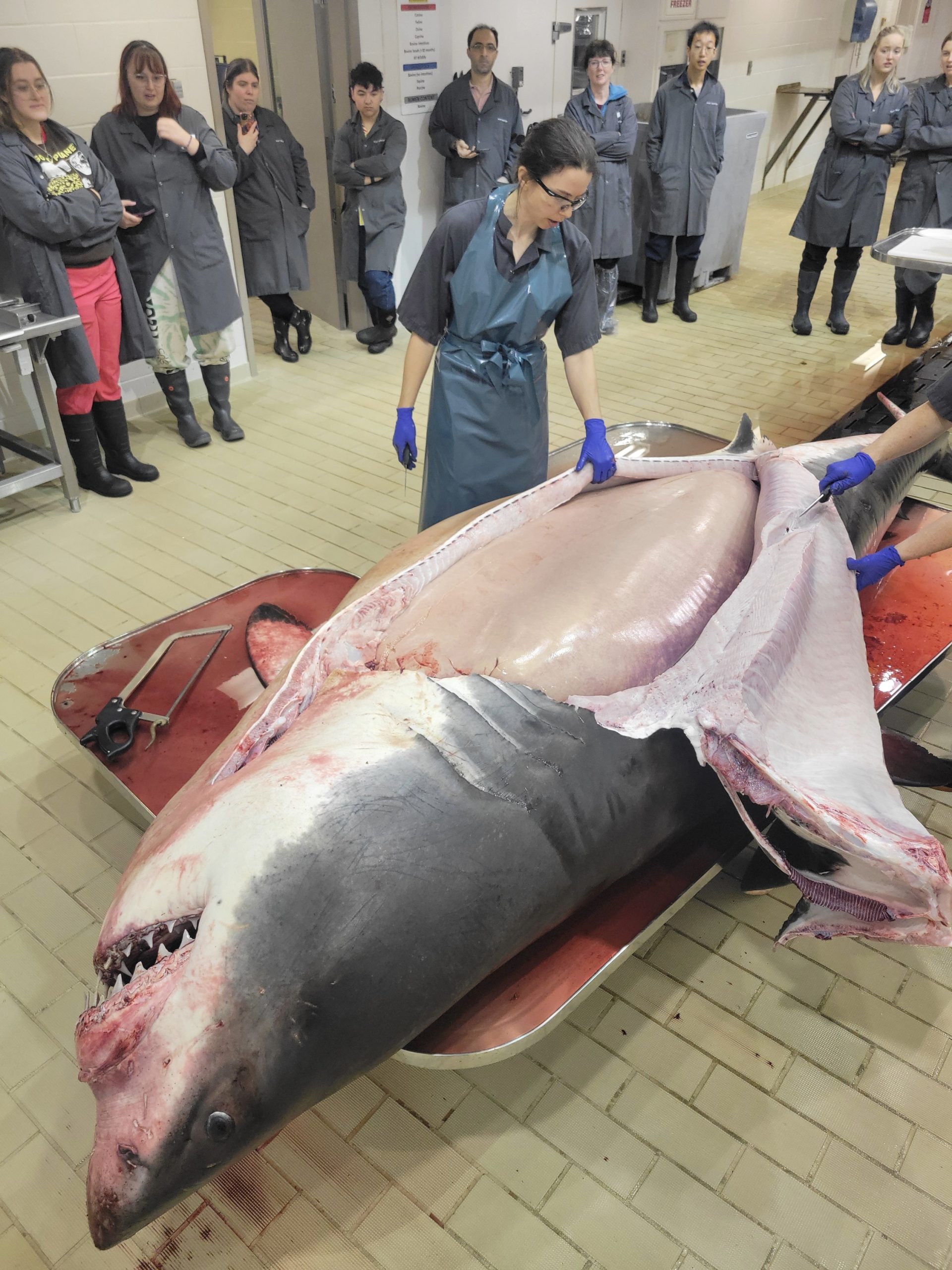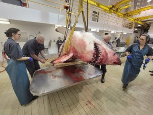 On October 29, 2025 a recently deceased white shark had been found on the shores of Prince Edward Island National Park and a Park’s team was being assembled to tow the fish to shore and transport it to the Atlantic Veterinary College (AVC) where a necropsy would be performed. This was the fourth white shark to wash up within a National Park in the Maritimes in the past 3 years and investigating these deaths is important as so little is known about the natural history of this species in the region.